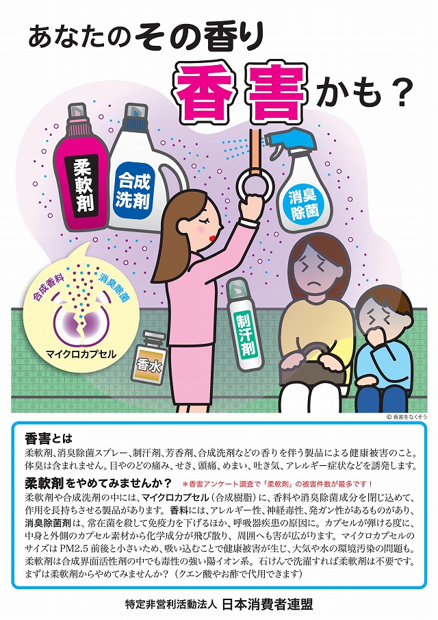 日本消費者連盟の洗剤部会メンバーが、マイクロカプセルに焦点を当てた香害ポスターを作りました。こちらのポスターはご自由にダウンロードしてお使いください。