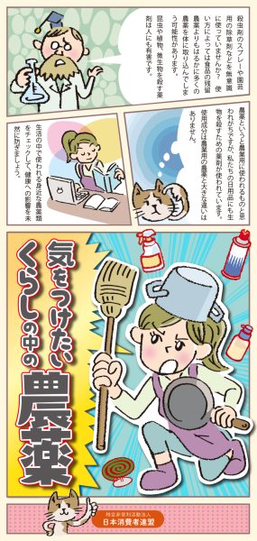 殺虫剤のスプレーや園芸用の除草剤などを無意識に使っていませんか?使い方によっては食品の残留農薬よりも多くの農薬を体に取り込んでしまう可能性があります。農薬を含む身近な製品は、くらしの中の思わぬところにたくさんあります。このリーフレットを家の中に貼り出して、みんなでチェックしてみてください。