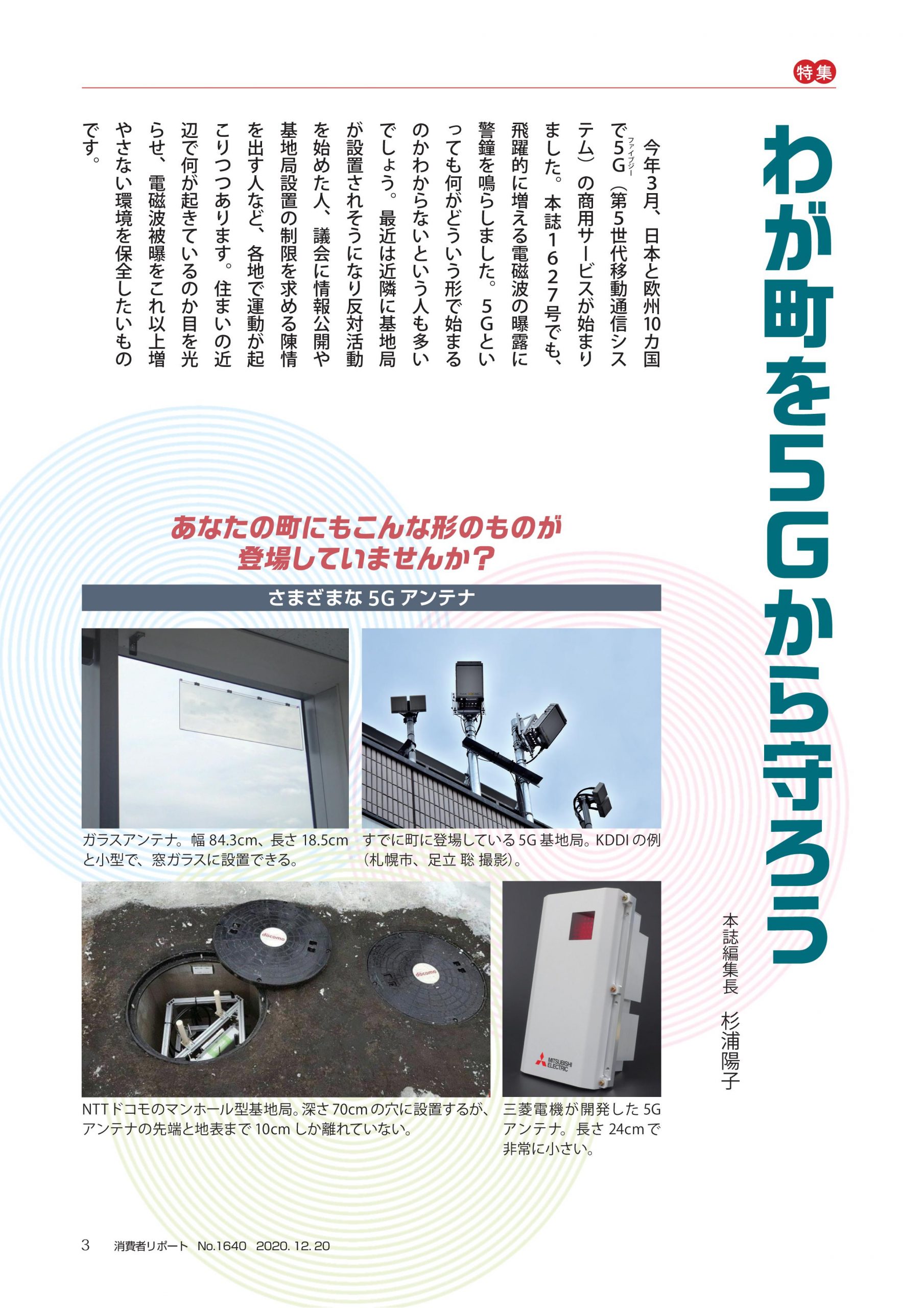 今年3月、日本と欧州10カ国で5ファイブジーG(第5世代移動通信システム)の商用サービスが始まりました。本誌1627号でも、飛躍的に増える電磁波の曝露に警鐘を鳴らしました。5Gといっても何がどういう形で始まるのかわからないという人も多いでしょう。最近は近隣に基地局 が設置されそうになり反対活動 を始めた人、議会に情報公開や 基地局設置の制限を求める陳情 を出す人など、各地で運動が起 こりつつあります。住まいの近 辺で何が起きているのか目を光 らせ、電磁波被曝をこれ以上増 やさない環境を保全したいもの です。